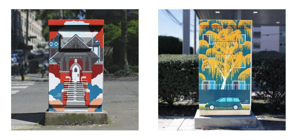 FHIA partnered with Seattle’s Department of Transportation to wrap signal boxes with art designed by Nathan Watkins.